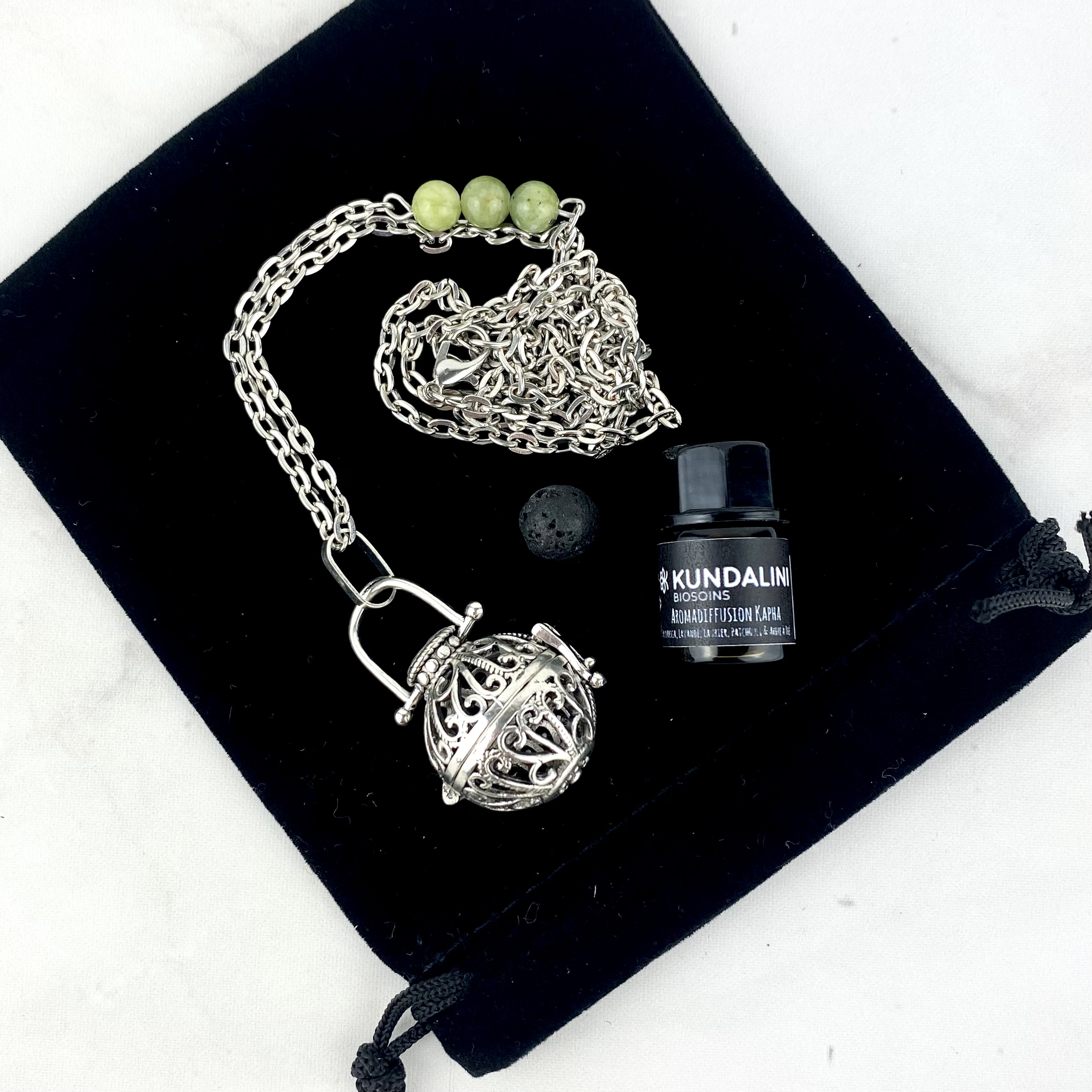 Ce bijou allie élégance, sensorialité et bien-être. Il vient avec un mini flacon du mélange d’aromadiffusion Kapha, composé d’huiles essentielles de lavande, laurier, palmarosa, arbre à thé et patchouli, choisi pour ses propriétés apaisantes et équilibrantes.